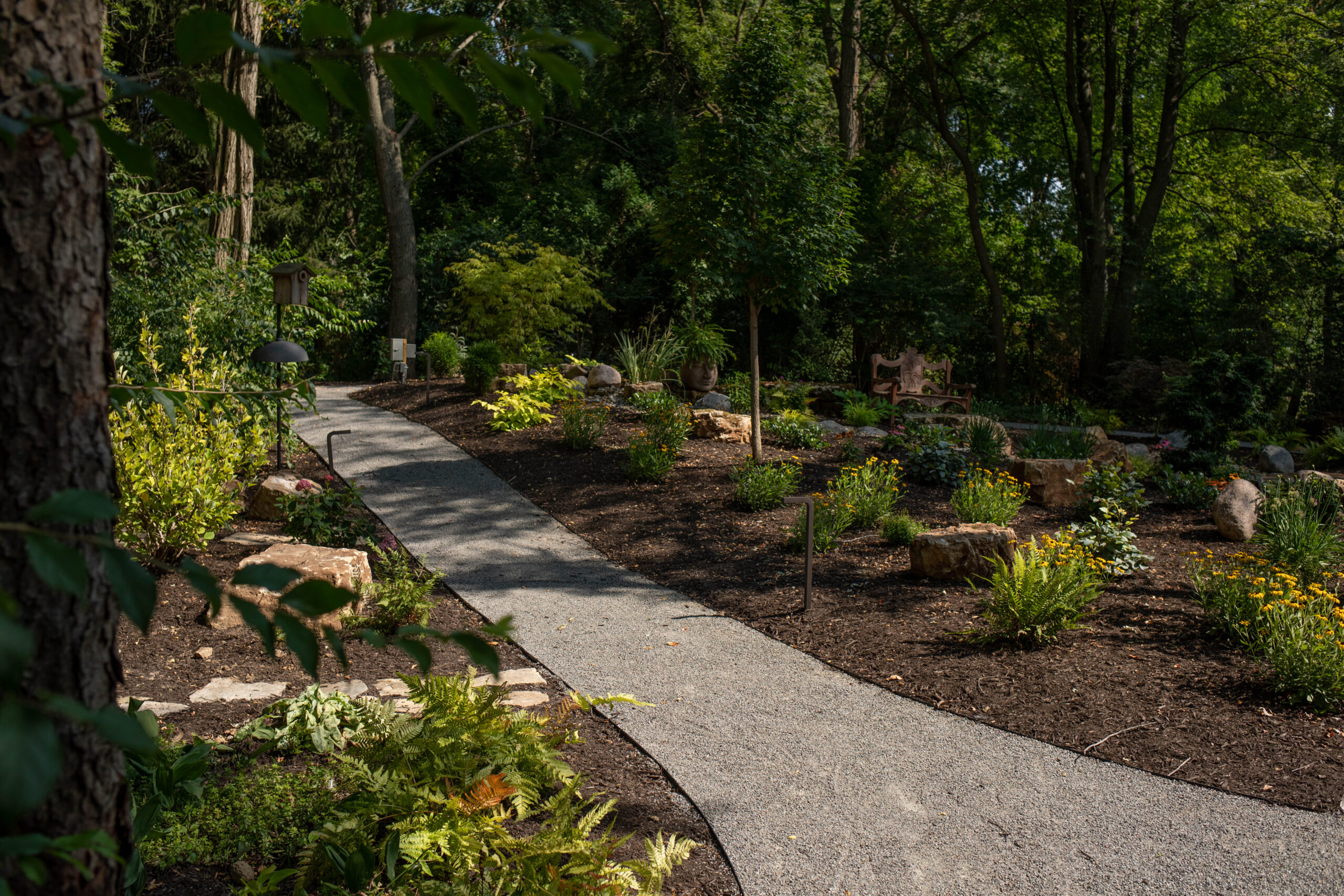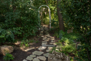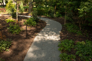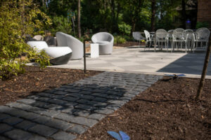 Clearing and filling the area: After the design has been finalized, our installation crews will clear any debris and plant-life from the space and then lay out the pathway with stakes and string. From there, we’ll apply any landscape fabric materials and level out the area with sand.